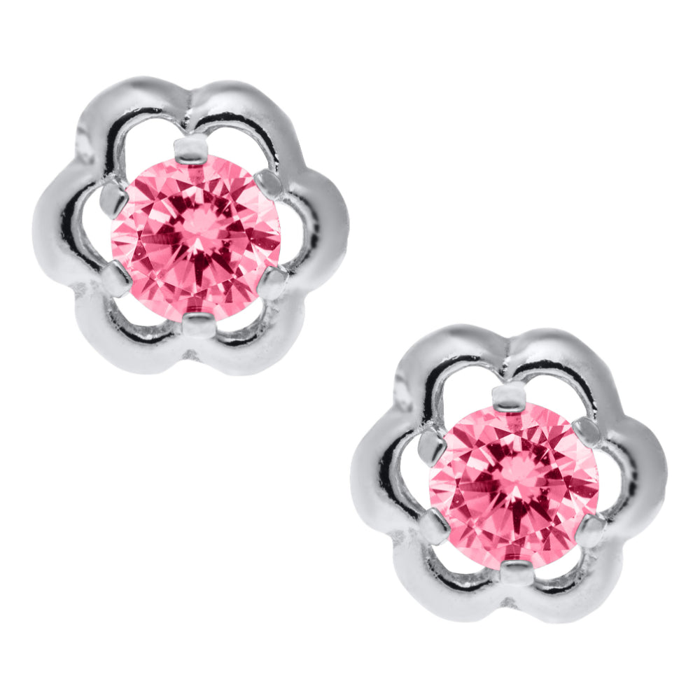 These petite flower earrings feature a bright pink cubic zirconia and have screw back posts for safety.