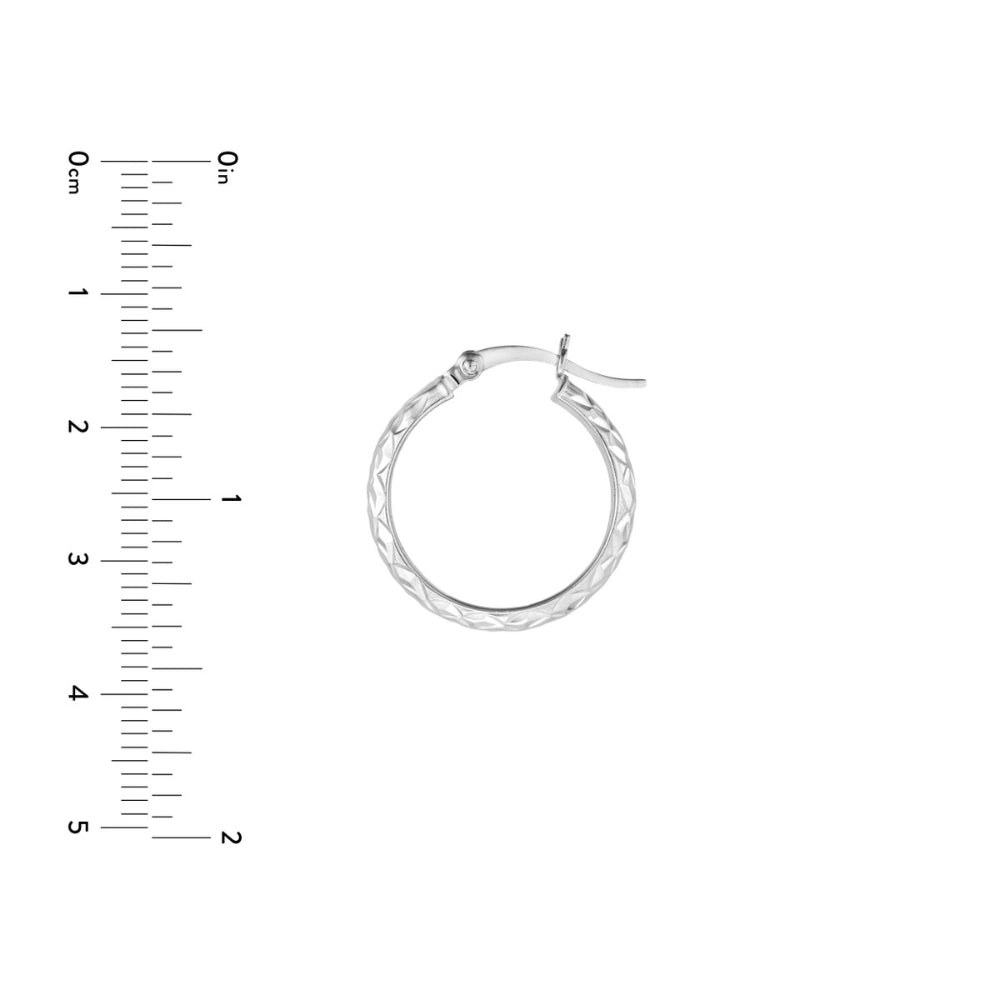 Full diamond-cut hoop earrings were made to shine, and these hoops do not disappoint. These sterling silver rhodium hoops radiate.