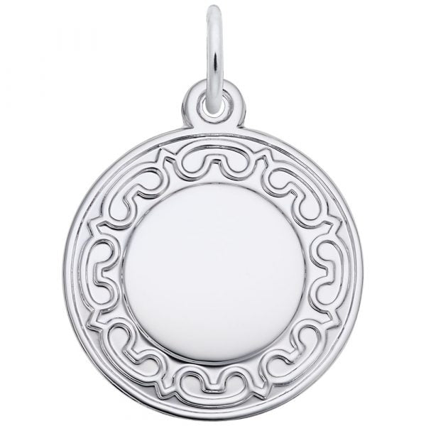 Engrave a memorable moment, message or anniversary with our Ornate Round Disc Charm. The perfect addition to any personal story. Available in silver and gold