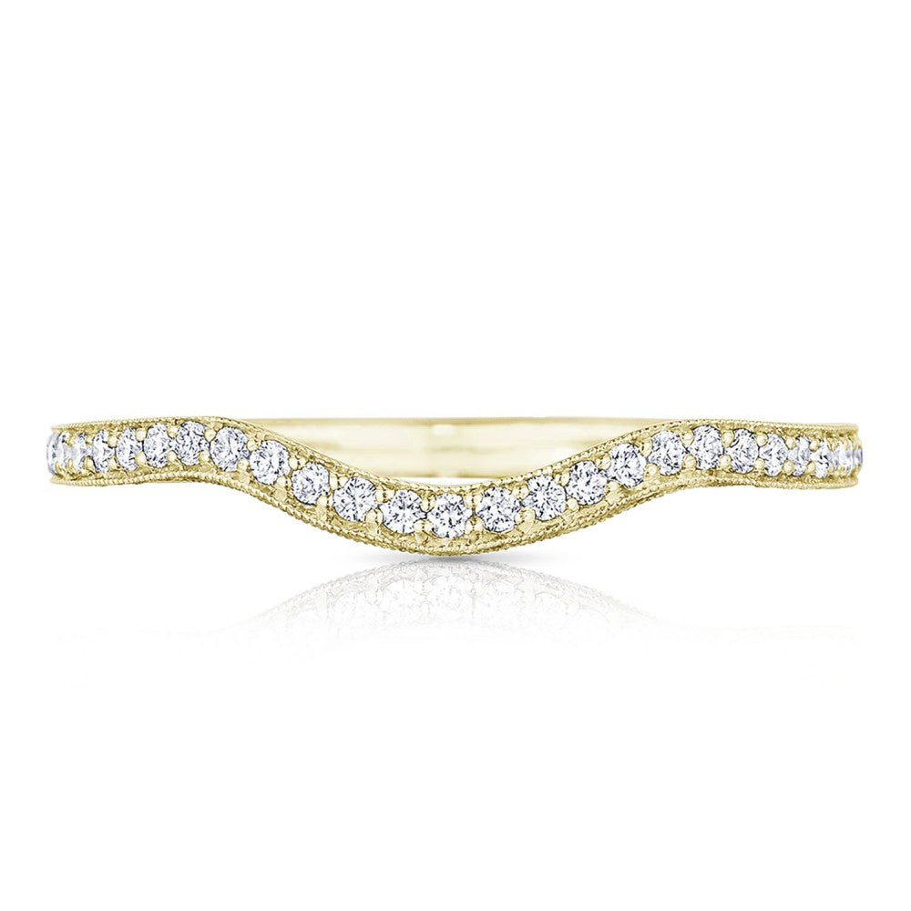 Wave hello to our newest wedding band shape, sure to fit the Tacori Bride who's looking for a unique and unconventional twist to the traditional wedding band. pavé set diamonds curve halfway round a gold diamond band. Worn delicately underneath your engagement ring or on top for dramatic effect, this curved ladies band truly bends the rule in wedding style.