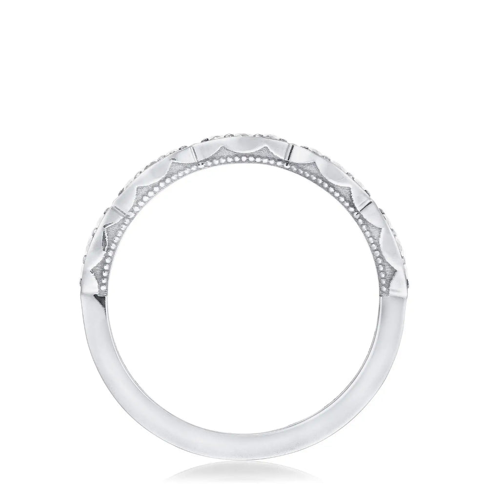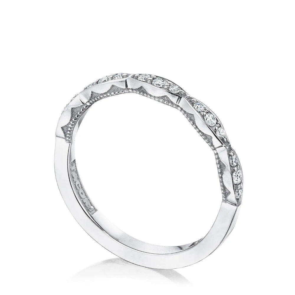 Marquise shapes studded with round-brilliant diamonds dance along the ceiling of the band and create a ribbon-like flourish. Clean and hand-carved Sculpted Crescent fabric adds texture to the inner face silhouette.