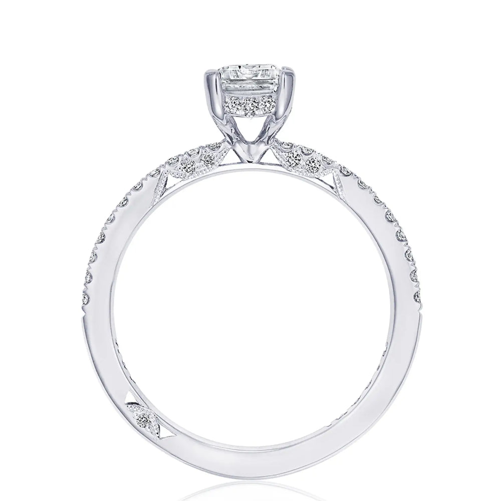 A romantic emerald solitaire floats on a Classic 360 foundation, above a thin, sparkling French- pavé band. The modern Simply TACORI crescent fabric decorates the upper ceiling of the ring, and a signature crescent marks the ring as Truly TACORI.
