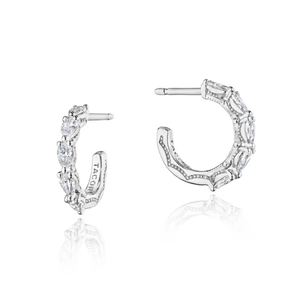 Delicate small hoop earrings of 18k White Gold are meticulously hand-set with pear-cut diamonds. Milgrain-studded TACORI Crescent detailing decorates the silhouette.