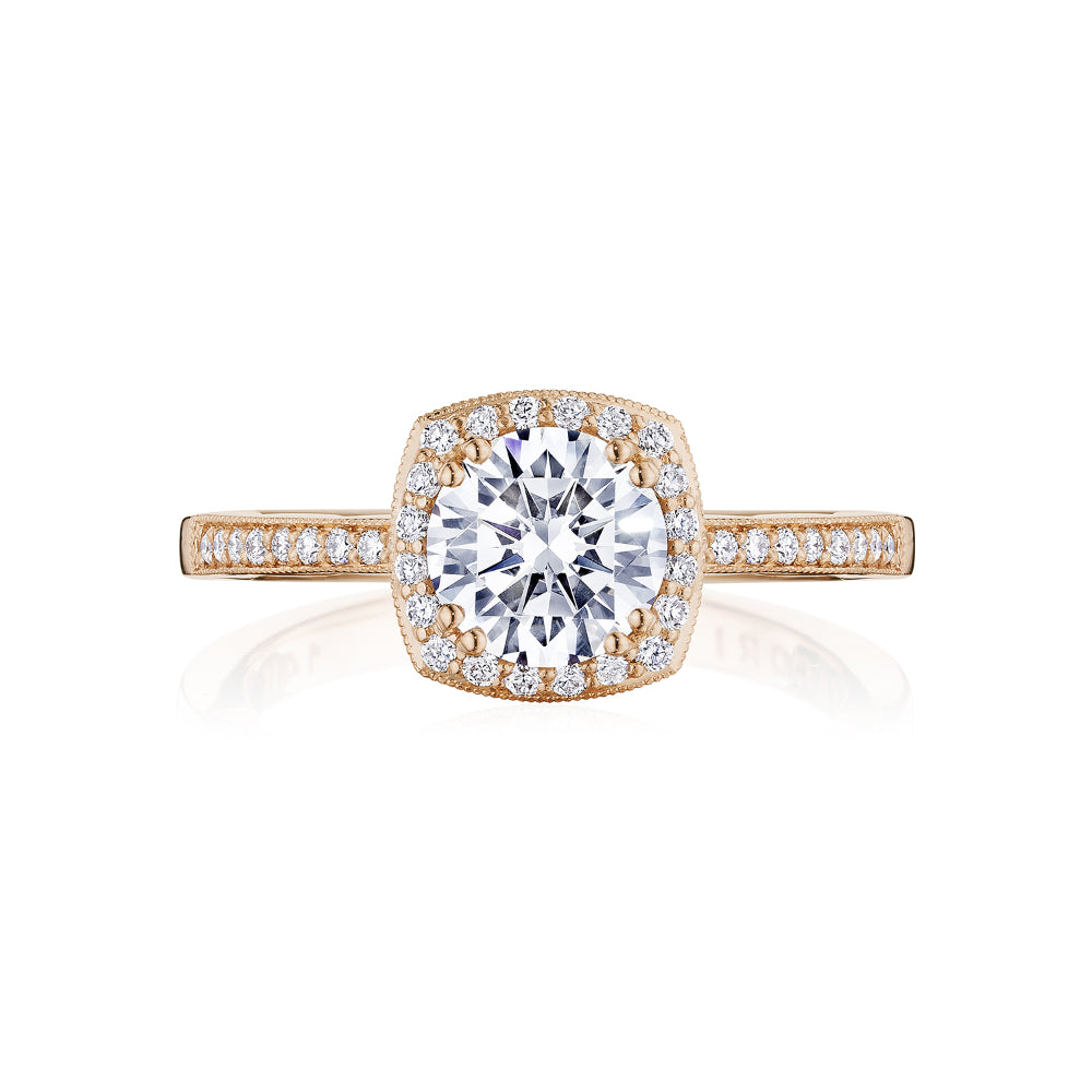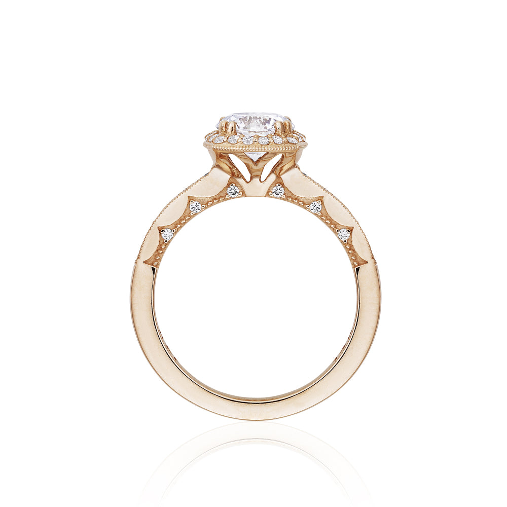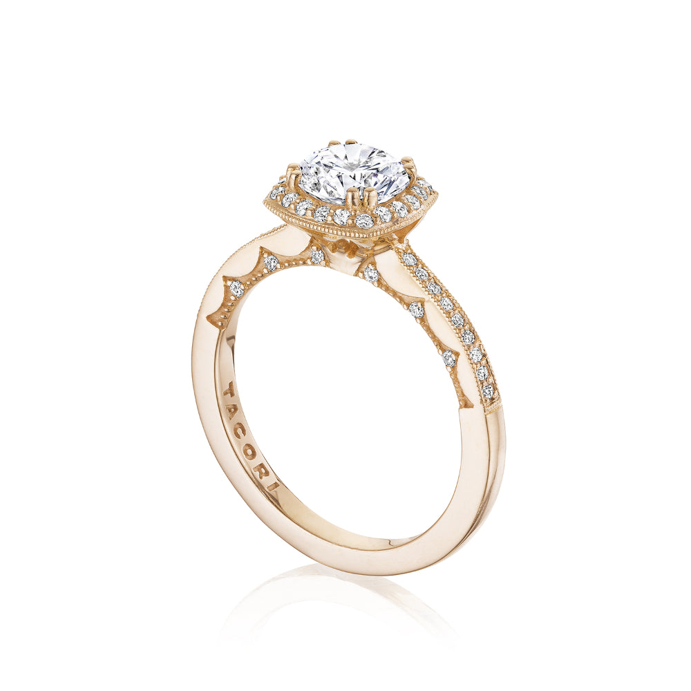 A round cut diamond is brought to life by a cushion-shaped bloom of diamonds and rests gently on a diamond band. This ring features the Coastal Crescent inner face with pinpoint diamond details for a truly regal look. Coastal Crescent is Tacori's only bridal collection offered in 14kt Gold. Made by hand in California.