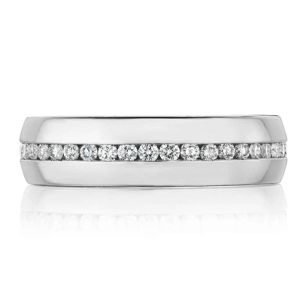 The high polish, softly-rounded exterior of this wedding band is encircled with eye-catching and expertly channel-set diamonds. The inner face of the ring boasts a full sculpted crescent detail with a soft-comfort fit for all day wearability