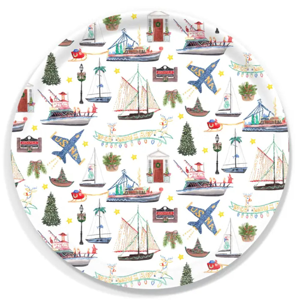 Celebrate the season seaside-style with our Annapolis Christmas tray, a festive blend of coastal charm and holiday magic. This cheerful design features sailboats strung with twinkling lights, Christmas trees aboard ships, cozy doors decked in wreaths, and nods to the beloved Annapolis harbor—all set against a crisp white background. Perfect for adding a nautical twist to your holiday gatherings!