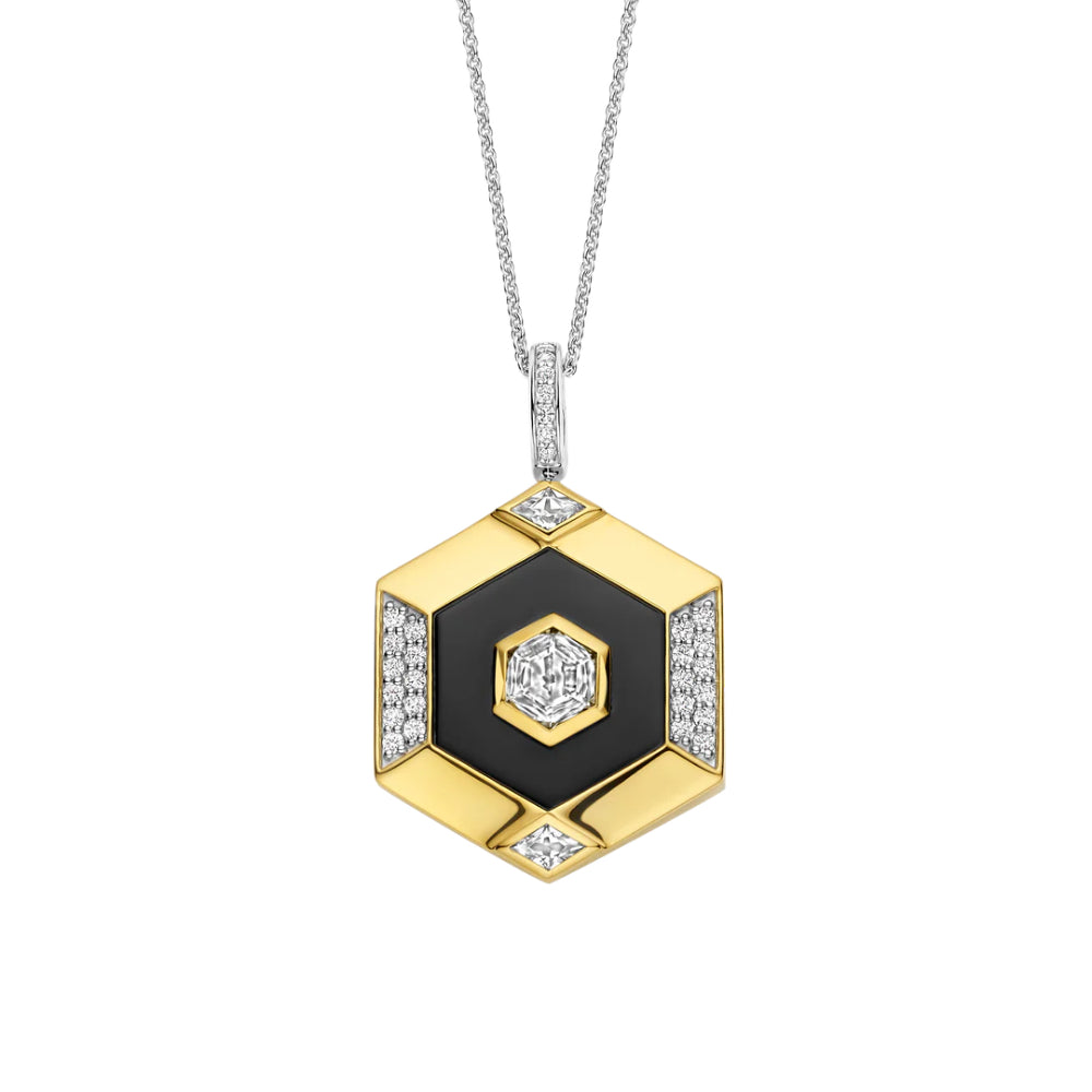 Embrace vintage glamour with a modern twist in this TI SENTO gold-plated silver Pendant 6838BL. Crafted from 925 sterling silver and plated with gleaming yellow gold, this geometric stunner is guaranteed to add a touch of opulence to any outfit. The striking hexagon shape frames a luxurious black stone, its rich colour captivating the eye. Delicate cubic zirconia stones dance around the edge adding a hint of sparkle.