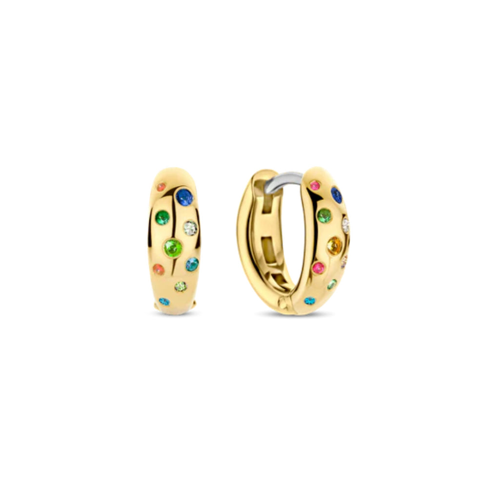 The TI SENTO Gold-Plated Silver Stardust Hoop Earrings bring a joyful burst of color and cosmic charm to your everyday style. Crafted from premium 925 sterling silver and bathed in warm yellow gold plating, these hoops are playfully sprinkled with multicolored cubic zirconia—deep blues, lush greens, warm ambers, and soft pinks—echoing the vibrant hues of a sun-drenched summer.