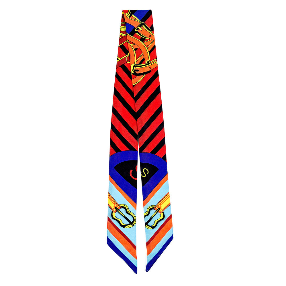 Featuring a horse saddle and buckle motif print, along with colorful geometric patterns. The Triple Crown Mini Scarf can be worn multiple ways, making it perfect for a variety of different looks.