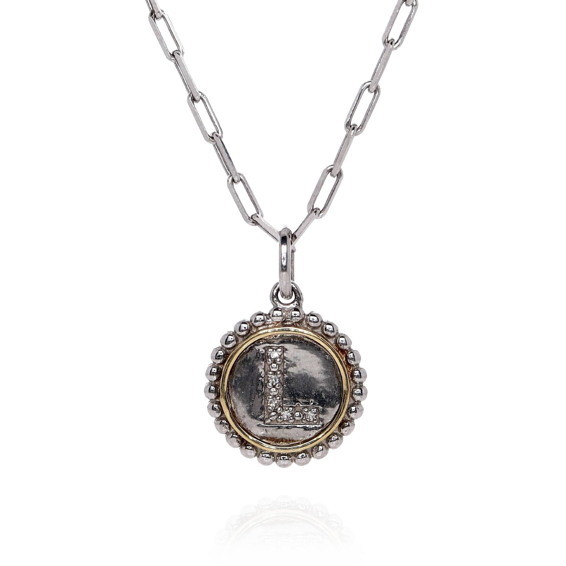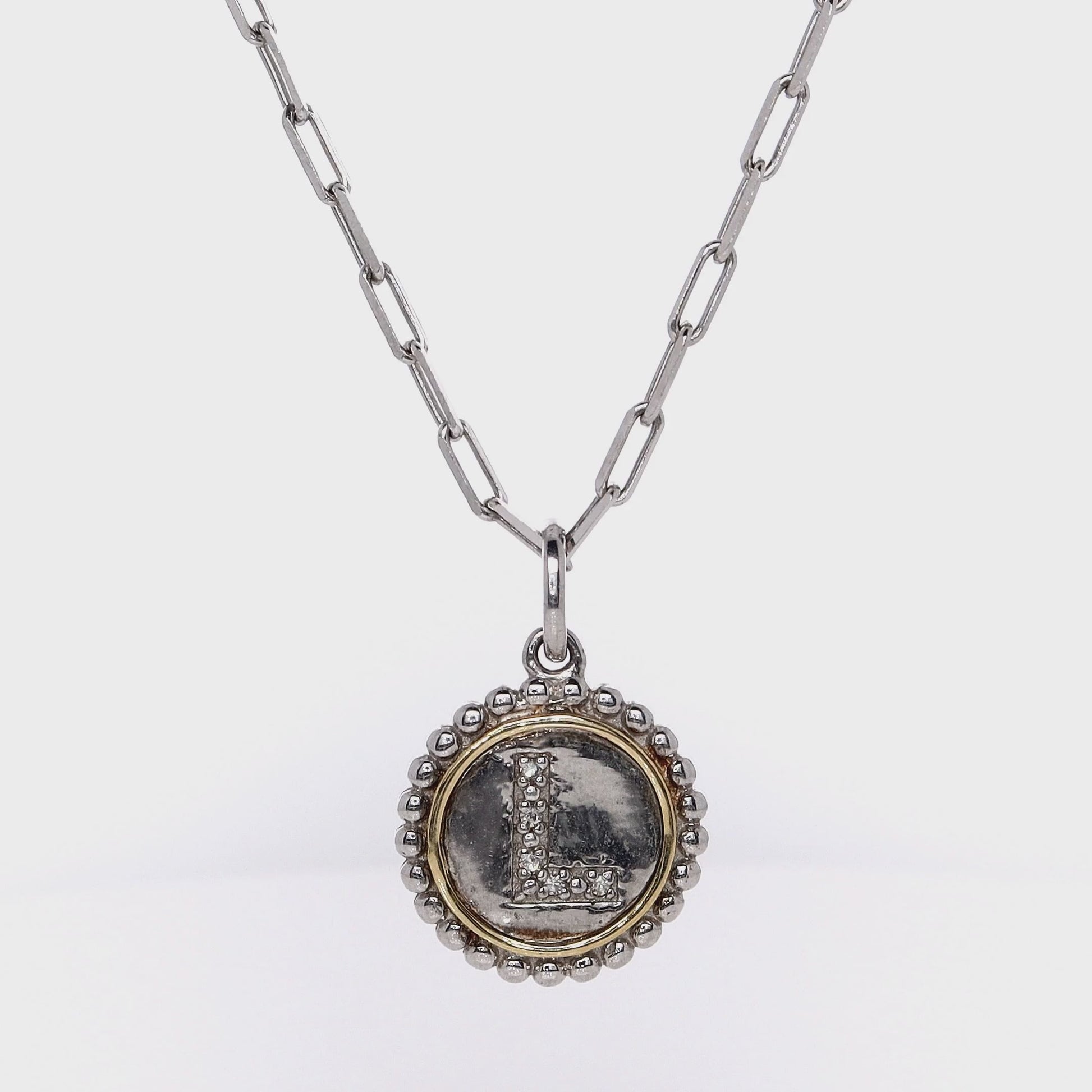 Two-Tone 20" Round Beaded Edge Initial "L" Pave Diamond Disc Pendant Necklace