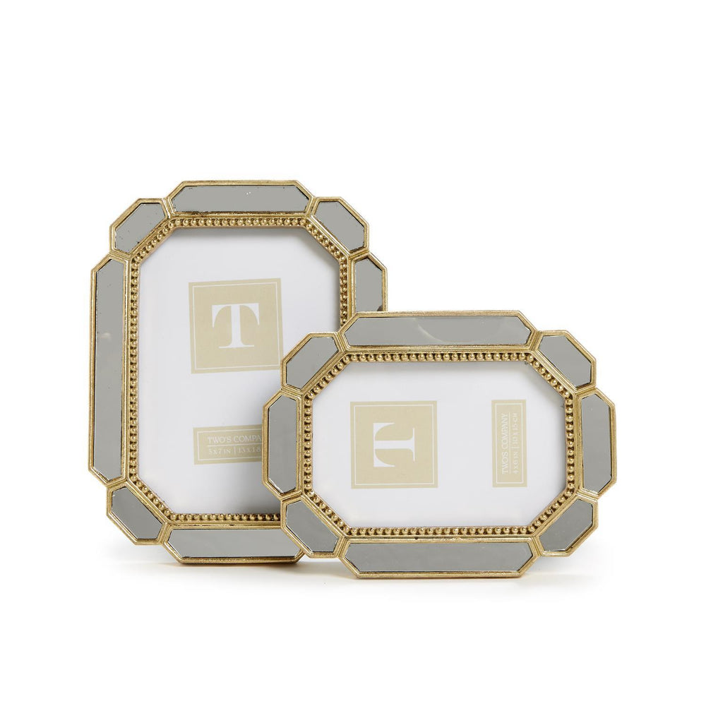 Elegance meets versatility in this Set of 2 Beveled Edge Photo Frames with Mirror Border. Crafted with a combination of resin, mirror, and glass, these frames are designed to elevate your cherished memories while adding a touch of sophistication to any space.