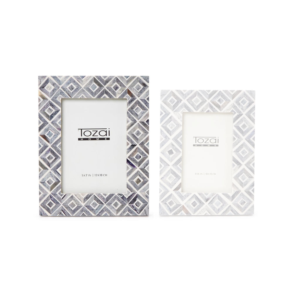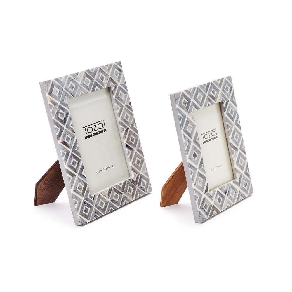So so chic. This classic mosaic patterned frame is beautifully hand made by skilled artisans of natural bone and resin. Each piece is hand cut and placed symmetrically to create an attractive graphic look.