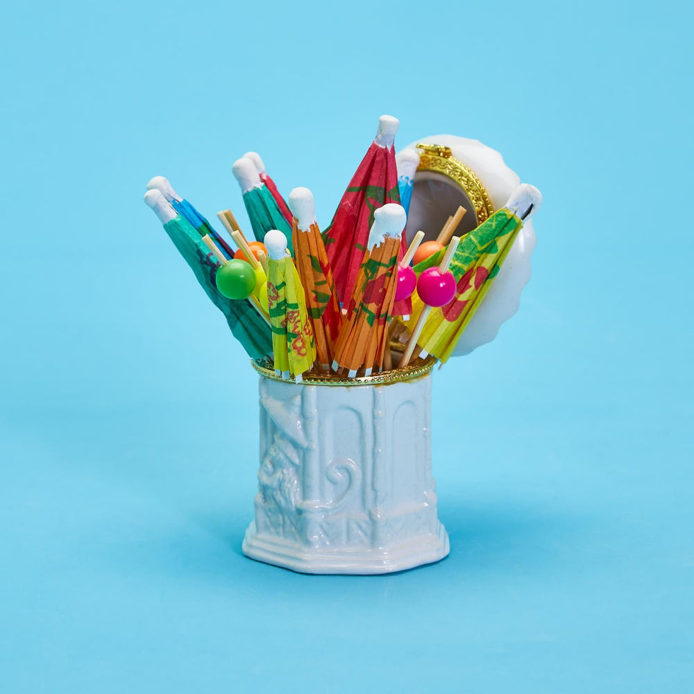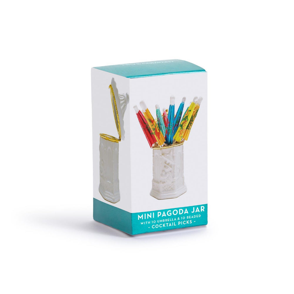 Two's Company has shrunk the traditional pagoda into a mini pick jar! Makes for a charming statement in your kitchen or bar area. Beautifully detailed porcelain with a lid comes packed in a gift box.