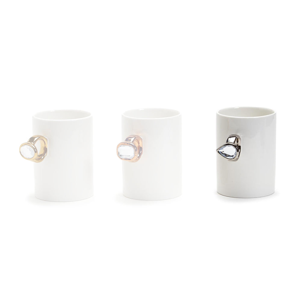Have a bit of bling with your beverage of choice with our gem adorned porcelain mug. Wonderful individual gift or for engagement parties and bridal showers. With fun sayings on the bottom and diamond ring on your finger holding a mug has never looked better.