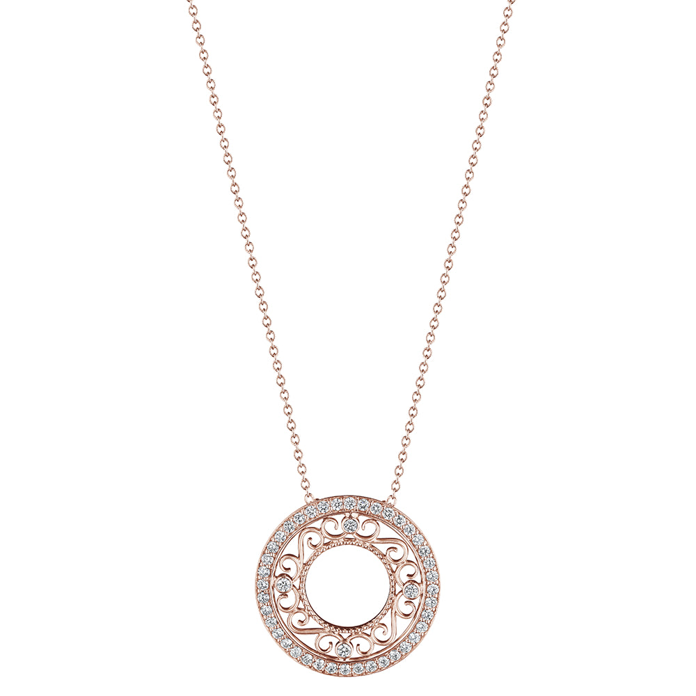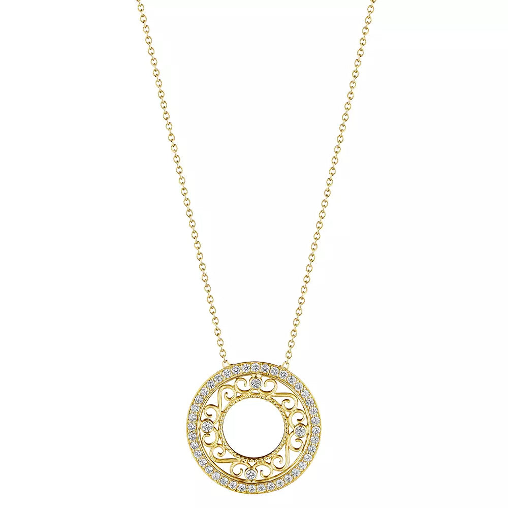This Verragio 18k diamond filigree circle pendant is a timelessly elegant piece of jewelry, crafted with exquisite attention to detail. Sparkling diamonds surround a delicate circle of gold, expressing a sophisticated style that will make a statement for any occasion. A perfect and unique accessory for any luxurious look.