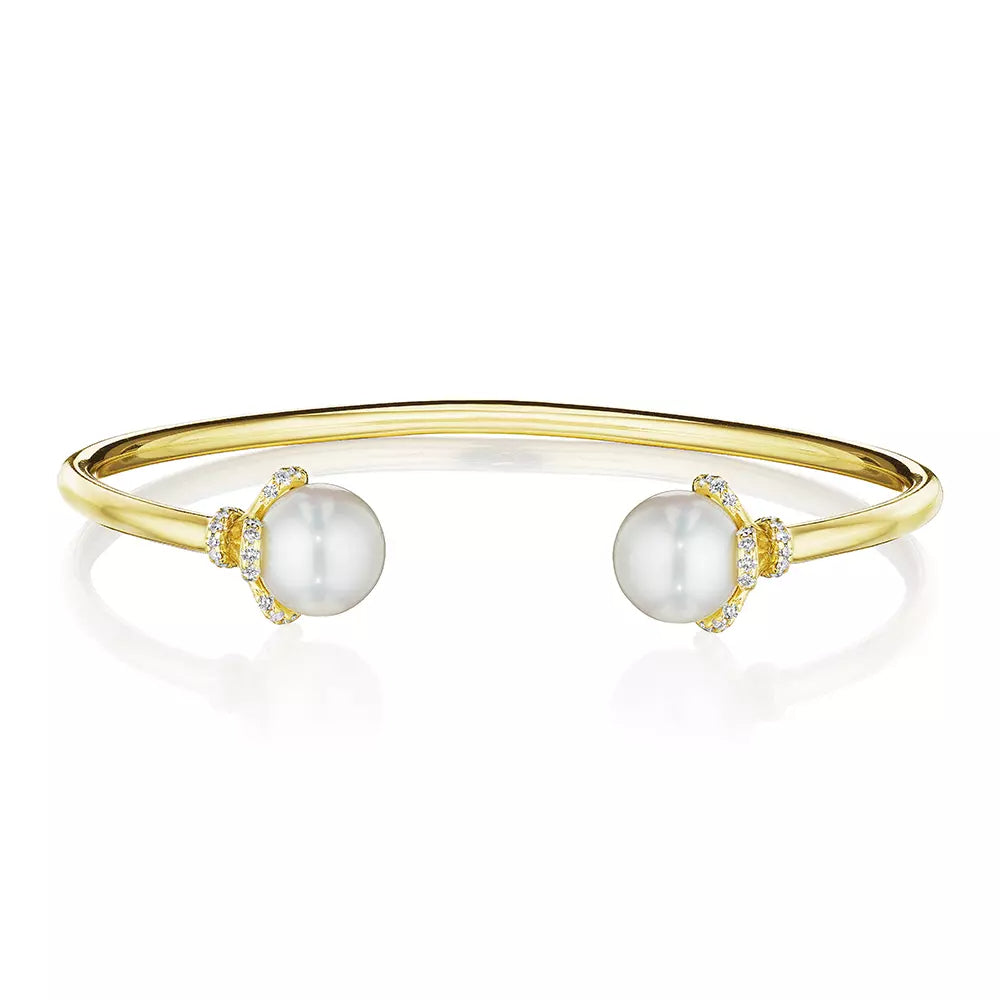 Add everyday luxury to your style with the Tiara Diamond and Pearl Bangle from Veritage. In 18k yellow gold, featuring dazzling diamonds and pearls, it's the perfect touch of romantic charm.
