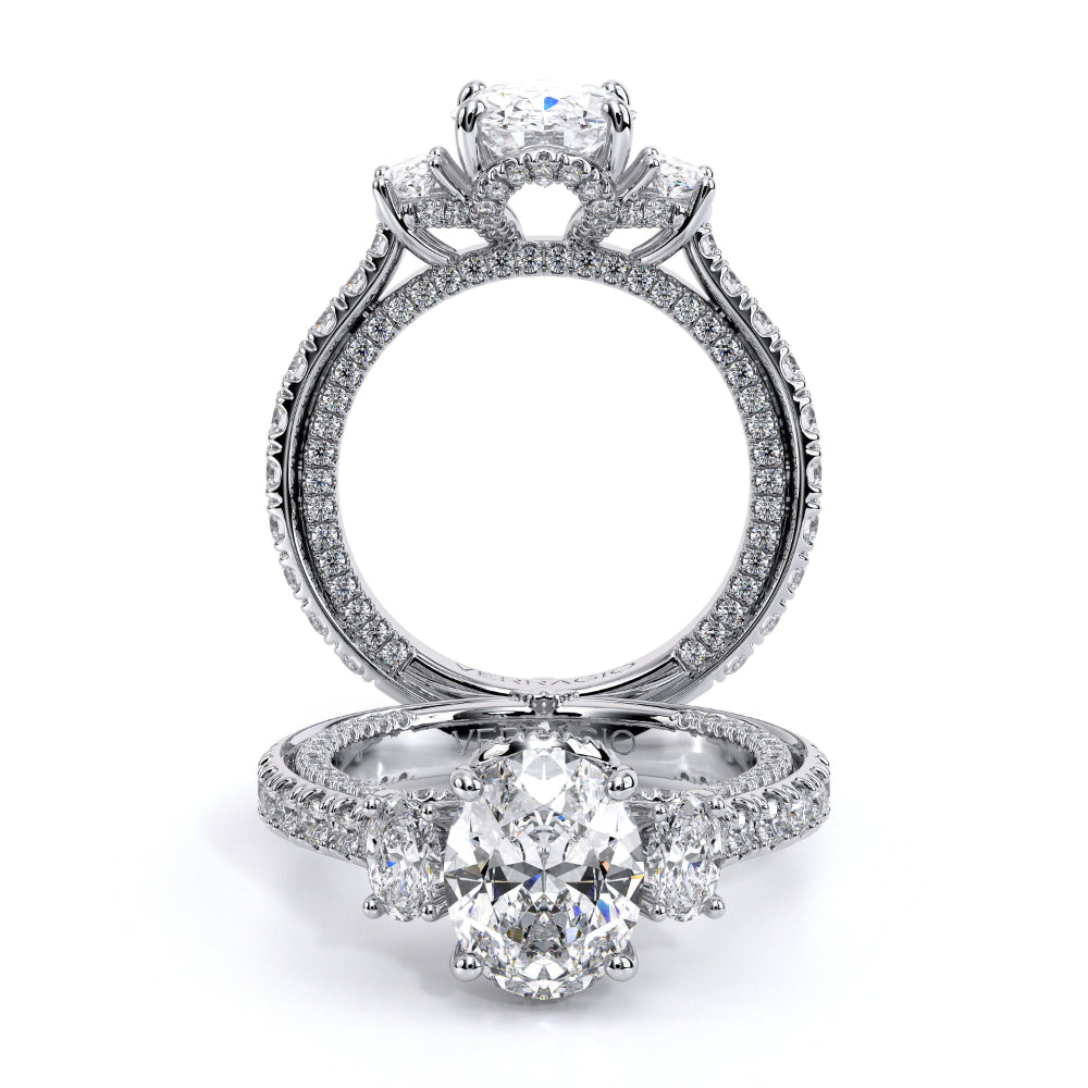 Couture-0479OV is the new Three Stone Engagement ring, highlighting the meticulously set diamond bridge elevating the surrounding Oval side stones. With the addition of our 3/4 Diamond Riviera and Verragio's signature crest the brilliance of this style is unlike any other.
