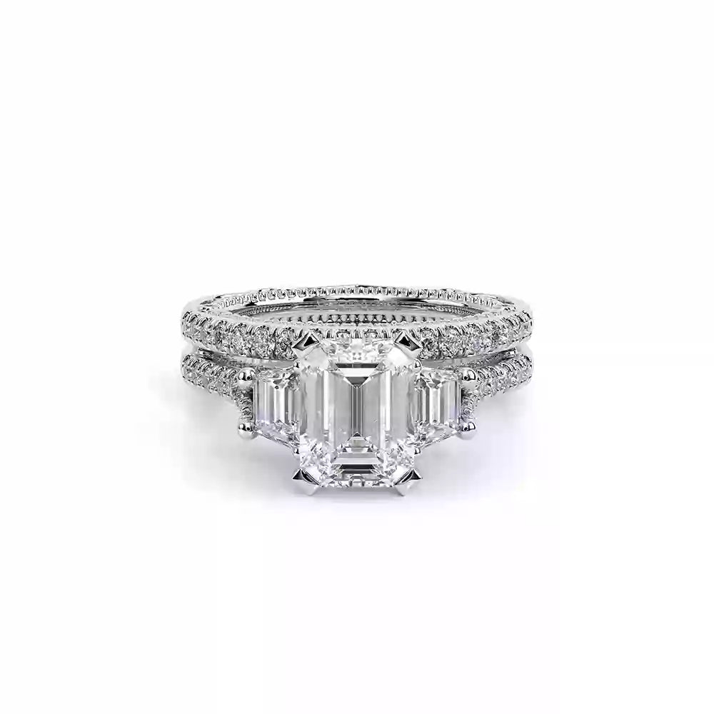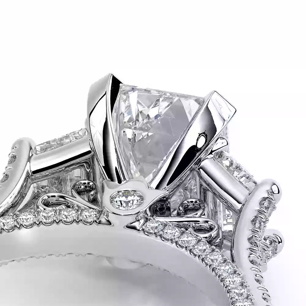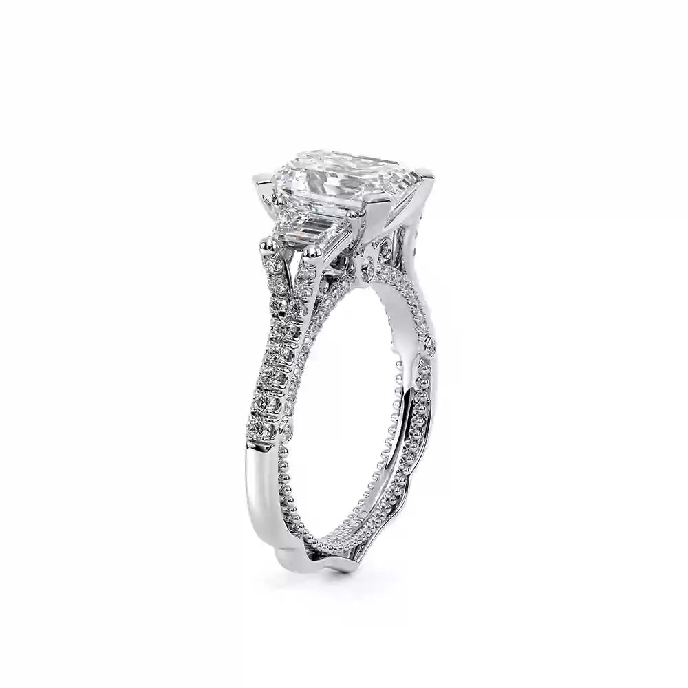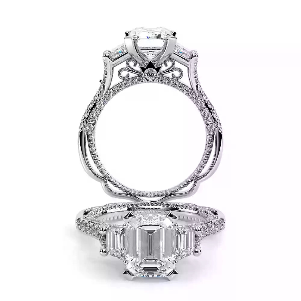 VENETIAN-5086EM is a three-stone engagement ring with trapezoid-cut side diamonds seamlessly integrated on a straight diamond band. The inner profile features our meticulously set half-diamond Riviera with handcrafted lacework, complete with Verragio's signature beading and crest.
