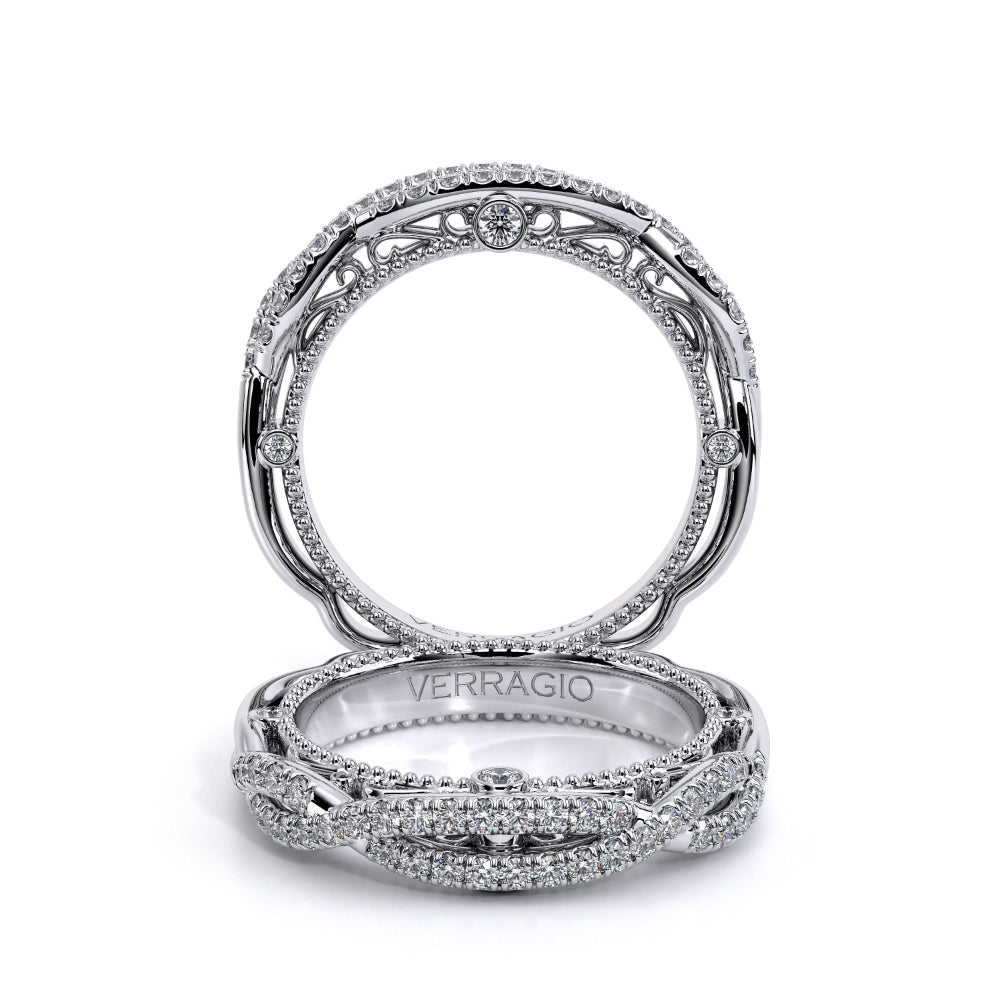 From the Venetian collection, this piece features a twisted band with round brilliant diamonds. This beautiful wedding band profiles three bezel set round diamonds on each sides placed perfectly in sync with our signature lace and beading. Opt for a twisted band or a straight band to match your Verragio engagement ring.